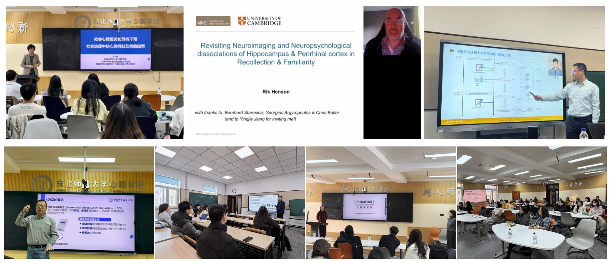 系列讲座立足于心理学研究前沿与国家战略需求,先后邀请国家级高层次领军人才、中国科学院心理研究所副所长(主持工作)、博士生导师蒋毅研究员,中国科学院心理研究所副所长、博士生导师陈雪峰研究员,国际认知神经科学领域记忆与老化研究的领军学者、英国国家学术院院士、剑桥大学认知神经科学家Rik Henson教授,认知与人格教育部重点实验室副主任、国家级高层次青年人才、西南大学心理学部副部长何清华教授,国家级高层次领军人才、国家重点研发计划首席科学家、中国科学技术大学张效初教授,陕西师范大学现代教学技术教育部重点实验室副主任、陕西基础教育质量检测中心副主任段海军教授,香港教育大学佟秀红副教授等七位专家学者担任主讲。讲座内容兼具理论深度与实践关怀,涵盖社会信息的无意识加工、重大突发事件心理服务、记忆的认知神经机制、游戏成瘾与冲动性、经颅电刺激技术应用、创造力研究的理论-实证-实践融合、句法意识在单语与双语阅读中的作用等前沿方向。